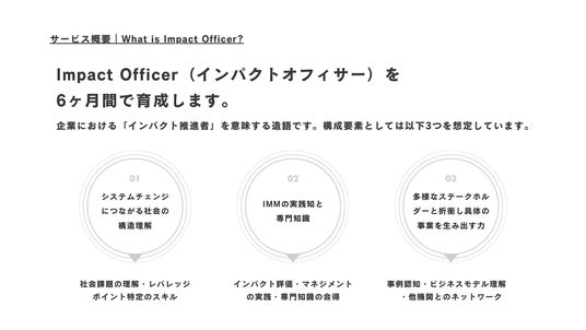 上記のようなIMMの実践を通じて企業の課題解決を行い、事業推進・成長へとつなげられる人材を、私たちは「インパクトオフィサー」と名付けています。