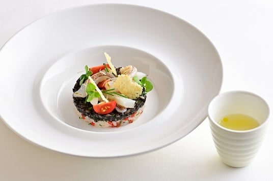 オードブル感覚のイカスミリゾットをライスサラダに。カルローズの茹で汁も活かした出汁茶漬仕立て。