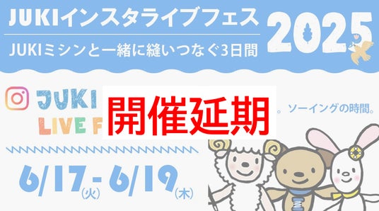 JUKI株式会社(本社:東京都多摩市、以下「JUKI」)は、6月17日~19日の3日間、開催を予定しておりました、家庭用ミシンのオンラインイベント「JUKIインスタライブフェス2025 ~JUKIミシンと一緒に縫いつなぐ3日間~」について、開催を延期することをお知らせいたします。