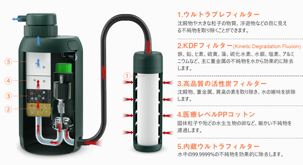 2022業界新型開発の電池携帯浄水器は、5段階のろ過を行なう浄水システム(ウルトラプレフィルター+ KDFフィルター+高品質の活性炭フィルター+レベルPPコットン+内蔵ウルトラフィルター)と超高品質の0.01ミクロンマイクロファイバーフィルターを採用し、99.9999%の細菌と99.999%のウイルスをろ過することができる。さまざまな不純物を除去することもでき、より安心でより安全に使用することができます。
