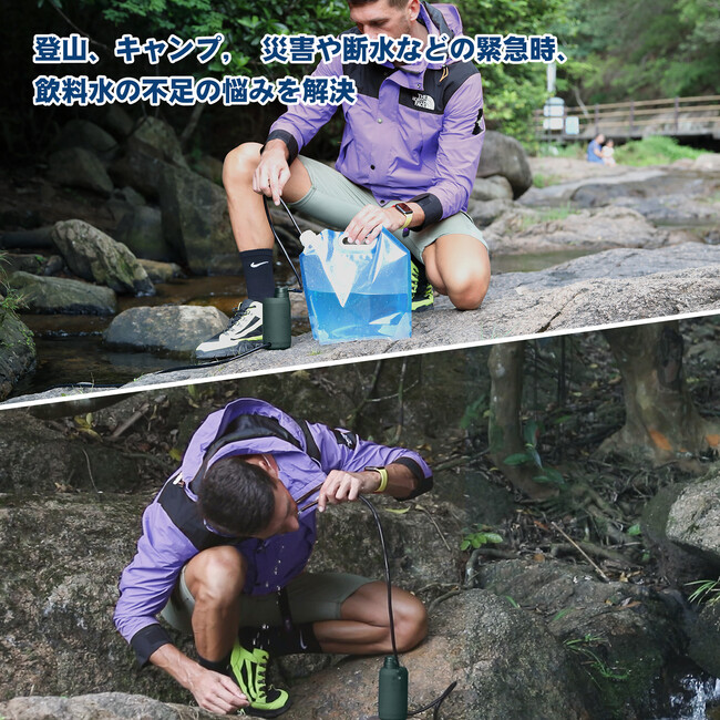 この災害用浄水器の携帯浄水器は、一度にたくさんの水を浄水できるため、地震、津波、台風などの自然災害が発生した場合、家族や友人など大人数で使用しても、飲み水に困りません。安心して飲めるほど透き通った清潔な飲料水にろ過することができます。雨水の浄化なども可能。 また、屋外活動、災害、夜間の取水に使用するスーパーサバイバルデバイスLEDライトにより、光のない場所でも、停電時や夜間にも安全に取水できます。