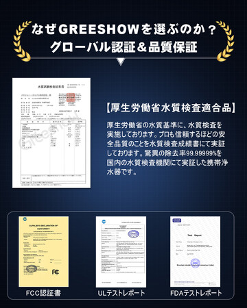 厚生労働省の水質基準に、水質検査を実施しております。プロも信頼するほどの安全品質のことを水質検査成績書にて実証しております。驚異の除去率99.99999%を国内の水質検査機関にて実証した携帯浄水器です。