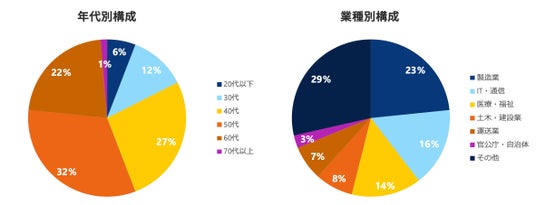 今回の調査では 、20代から70代以上のすべての年齢層の主に「製造業」「IT・通信」「医療・福祉」の中堅~ベテラン層の方からご意見をいただきました。