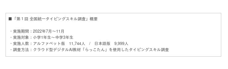 なお、文部科学省が令和3年に実施した情報活用能力調査の速報結果(※)では、1分間あたりの文字入力数(ひらがな、カタカナ、漢字、アルファベット等の組合せ)が15字未満にとどまった児童生徒は、小学5年生:51.2%、中学2年生:23.3%だったとし、タイピング能力の底上げを図りたいとしています。