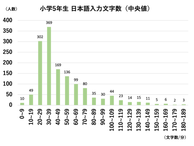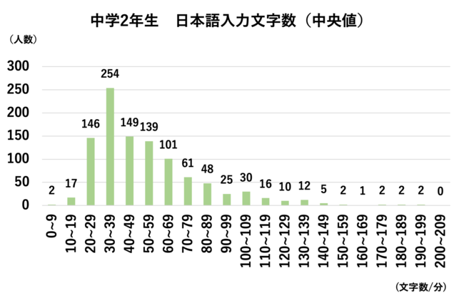 また、小学5年生と中学2年生の入力速度分布を見てみると、どちらの学年も幅広く分布していることがわかります。