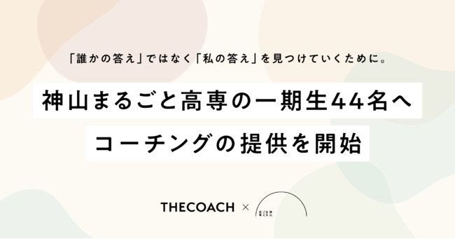 オンラインコーチングスクール「THE COACH Academy」、コーチングプラットフォーム「THE COACH Meet」、法人向け人材育成・組織開発サービス「THE COACH for Business」を提供する株式会社 THE COACH(本社:東京都渋谷区、代表取締役:岡田裕介、松浦瞳)は、2023年4月開校の私立高等専門学校「神山まるごと高等専門学校」(学校長:大蔵峰樹、設置場所:徳島県名西郡神山町、以下「神山まるごと高専」)の一期生44名に対してコーチングの提供を開始いたします。