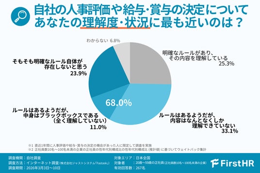 「明確なルールがあり、その内容を理解している」と回答した割合は25.3%にとどまりました。一方で、「ルールはあるようだが、内容はなんとなくしか理解できていない」は33.1%、「ルールはあるようだが、中身はブラックボックスである(全く理解していない)」は11.0%、「そもそも明確なルール自体が存在しないと思う」は23.9%となっています。