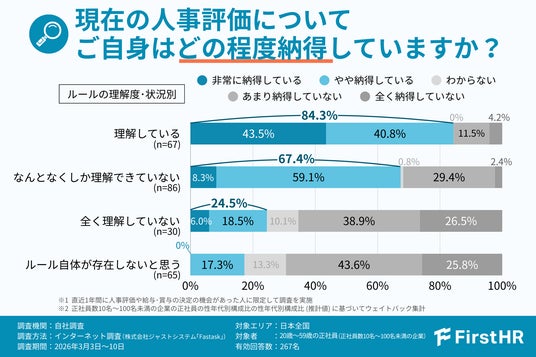 「非常に納得している」と「やや納得している」を合わせた肯定的な回答は、自社の評価基準を「理解している」層で84.3%に達しました。一方で、「なんとなくしか理解できていない」層では67.4%となり、ルールの理解度が不十分になることで納得度も低下する結果となっています。