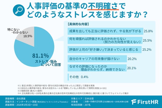 「成果を出しても正当に評価されず、やる気が下がる(25.8%)」「何を頑張れば評価されるのかわからない(25.5%)」「評価が上司の『好き嫌い』で決まっていると感じる(25.2%)」が上位に並ぶ結果となりました。これに、「自分のキャリアの将来像が描けない(20.2%)」「なぜその評価になったのか理由がわからず、納得できない(20.1%)」が続いています。