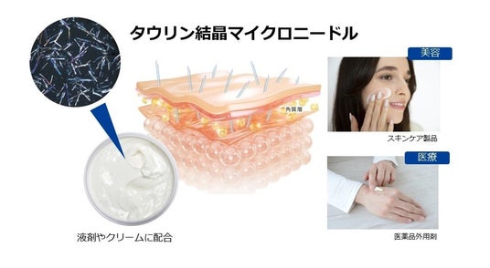 タウリン結晶マイクロニードルを液剤やクリームに安定的に分散させることで、皮膚に塗るだけでニー