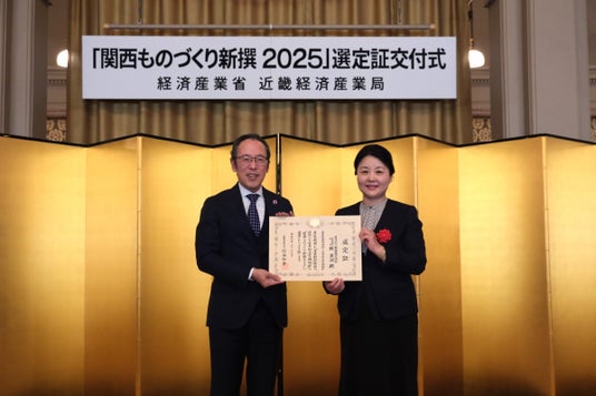 この「タウリン結晶マイクロニードル」が、経済産業省近畿経済産業局が関西の中小企業が新たに開発した製品・技術等を選定する「関西ものづくり新撰2025」において、健康社会を実現する技術として特別賞を受賞。2025年2月26日(水)に開催された選定証交付式において、選定証の交付を受けました。