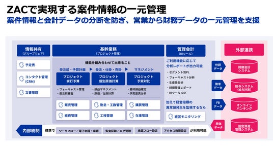 「ZAC」は、案件別の工数管理や原価・見積管理、売上管理などの機能を一元化し、プロジェクト進行や収支状況の可視化を実現することで、業務の効率化やデータに基づく経営判断を支援するツールです。