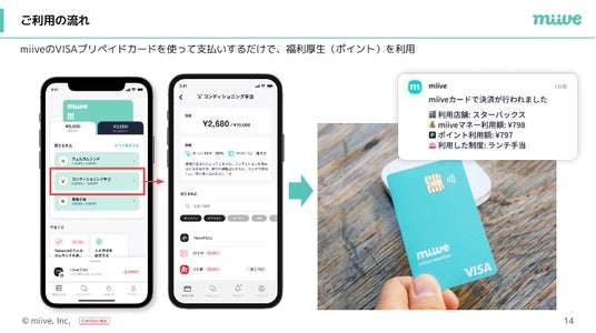 従業員はmiiveが提供するプリペイドカードを使って支払いを実行、付与されたポイントが自動適用され決済実行