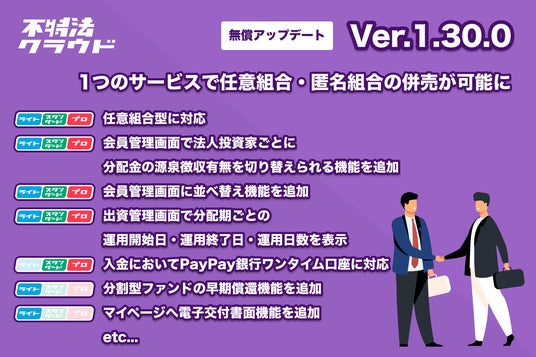 ver1.30では、組合方式を選択できる機能を追加。任意組合・匿名組合のファンドを1つのサービスで併売することができるようになりました。