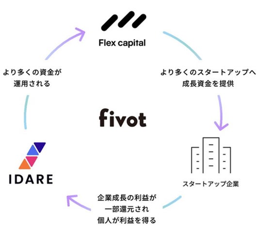 スタートアップ向け融資事業「Flex Capital」と、個人向け貯まるキャッスレスアプリ「IDARE」の2つの事業を展開しており、この2つを組み合わせた資金循環エコシステムの構築を通じて、スタートアップへの成長資金の供給、そのリターンの還元による個人の資産形成支援の両立を実現しています。