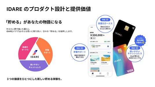貯まるキャッシュレスアプリ「IDARE(イデア)」はVisaブランドのプリペイド機能を有した決済アプリです。貯めた残高に対して年率2%相当のボーナスを還元する他の決済アプリにはないボーナス設計により、“自然に貯まる仕組み”を提供しています。また、AIを活用した「プロ野球応援ボックス」機能など、趣味やライフスタイルに応じ「楽しく貯める」機能を展開し、個人の皆さまの資産形成を支援しています。