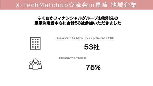 株式会社ふくおかフィナンシャルグループ(取締役社長 五島 久、以下「ふくおかフィナンシャルグループ」) 傘下の株式会社FFGベンチャービジネスパートナーズ(代表取締役社長 吉田 泰彦、以下「FVP」)は、スタートアップと地域企業のネットワーキングイベント『 X-Tech Match up(クロステックマッチアップ) 交流会 in長崎』を開催いたしました。