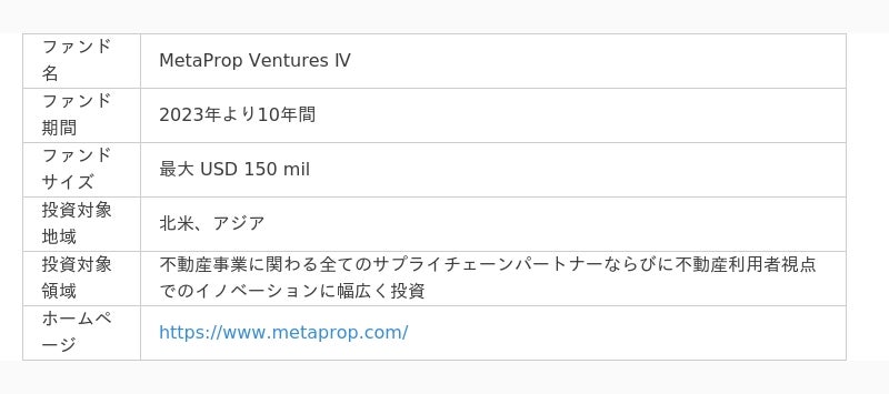 MetaPropは2015 年にニューヨークを拠点とし設立された、不動産テクノロジー(PropTech)領域に特化したベンチャーキャピタルです。2015年設立以降、不動産のバリューチェーンに関わる175社以上のテクノロジー企業に投資をしており、同領域における投資件数は米国最多となっています。今回組成したMetaProp Ventures IVでは、北米や東アジアを投資対象地域としており、日本ではトグルホールディングス株式会社、株式会社ヤモリ、アスエネ株式会社、株式会社H2 Corporationなどに投資しています。