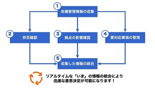 リアルタイムに情報を集約することで、自社の「いま」の状況をタイムラグなく把握することができます。これにより、企業の災害対応を効率化し、事業継続や復旧に向けたスムーズな意思決定をサポートします。