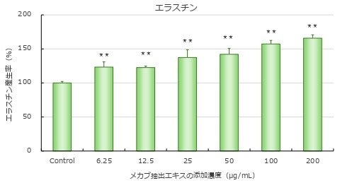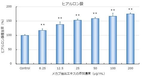 その結果、6.25~200 μg/mlの範囲で細胞毒性は認められず、ヒアルロン酸及びエラスチンの産生が「メカブ抽出エキス」無添加の場合と比較して有意に促進されました。以上のことから、ヴェントゥーノの化粧品原料「メカブ抽出エキス」には、肌の保湿や弾力性維持などの有用な働きが期待されます。