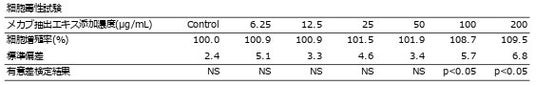 表1に同試験における細胞毒性試験の結果を示します。メカブ抽出エキスは、6.25~200 μg/mlにおいて、細胞毒性を示しませんでした。