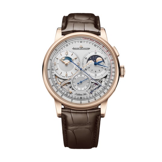 キャリバー391 のために、ジャガー・ルクルトの技師は手巻モノプッシュ クロノグラフとムーンフェイズ表示、ナイト&デイ表示、そして 2 つのパワーリザーブ表示とフドロワイヤント針(フライングセコンド)表示を組み合わせ、全てを組み込んだムーブメントを一から開発しました。