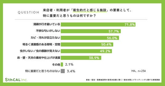 - 来訪者が衛生的だと感じる要素は、「清掃が行き届いている」(71.8%)が最多だが、「不快な匂いがしない」(57.7%)、「カビ・汚れが目立たない」(56.0%)、「明るく清潔感のある照明・空間」(50.4%)、「虫がいない/痕跡が見えない」(49.2%)など、複数要素が約半数前後で並んだ