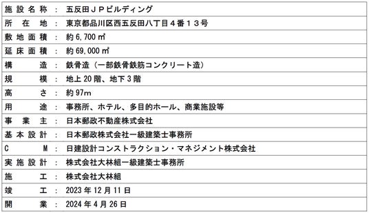 日本郵政不動産株式会社(東京都千代田区、代表取締役社長 山代 裕彦)は、「旧ゆうぽうと」跡地(東京都品川区西五反田)にて進行中の「五反田JPビルディング」を、2024年4月26日(金)にグランドオープンいたします。