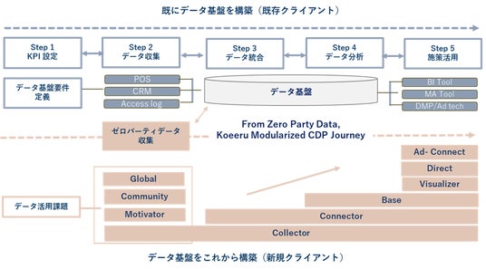 データ基盤をこれから構築する新規クライアントには、Koeeruが提供する機能を活用し、段階的にデータ基盤を構築します。