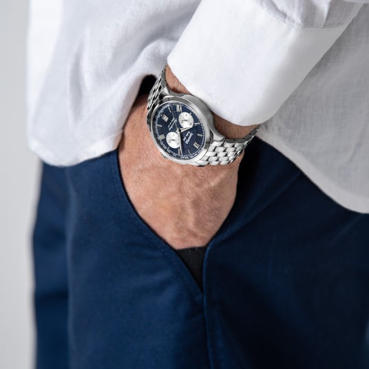 銀色と銀色/黒色/青色のカウンター、青色と銀色のカウンター、そして青色のグラデーション文字盤と青色のカウンターを備えた非常に独創的な「トータル ブルー」もあります。文字盤のバージョンに応じて、黒または青色のアリゲーターレザーのクラシックなストラップ、またはよりスポーティな外観のスティール製ブレスレットが用意されています。