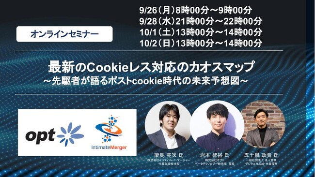 国内最大級パブリックDMPを提供するデータプラットフォームカンパニーの株式会社インティメート・マージャー(本社:東京都港区、代表取締役社長:簗島 亮次、以下当社)は、「デジタルで、この国の新しい基本をつくる。」をミッションに掲げ、顧客の事業成長に伴走する株式会社オプト(本社:東京都千代田区、代表取締役社長 CEO:栗本 聖也、以下、オプト社)と本年9月1日(木)に開催した無料オンラインセミナー「最新のCookieレス対応のカオスマップ~先駆者が語るポストCookie時代の未来予想図~」を9月16日(金)、28日(水)、10月1日(土)、2日(日)の4日間限定で再放送することをお知らせします。