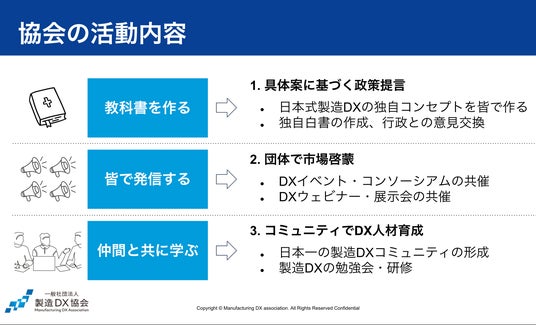 製造DX協会は、以下の3つの柱を中心に活動を展開します:
