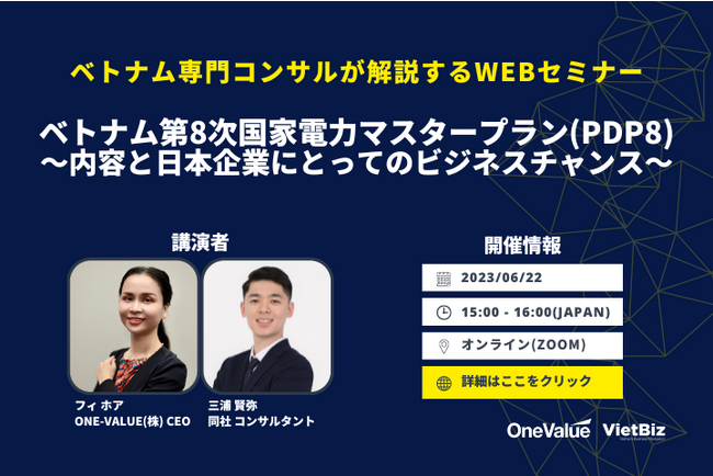 ベトナムに特化した経営コンサルティング企業であるONE-VALUE株式会社(東京都江東区、CEO:フィ ホア)は、「ベトナム第8次国家電力マスタープラン(PDP8)の内容と今後の日本企業にとってのビジネスチャンス・アクション徹底解説ウェビナー」を、2023年6月22日(木)の15時より開催します。