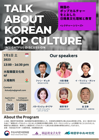 駐大阪韓国文化院と同志社女子大学は、7月1日(土) に、韓国学中央研究院・海外韓国学支援研究事業として、「韓国のポップカルチャーをとおした日韓異文化理解と教育」をテーマにした特別講演 "Let's talk about Korean Pop Culture"を開催する。