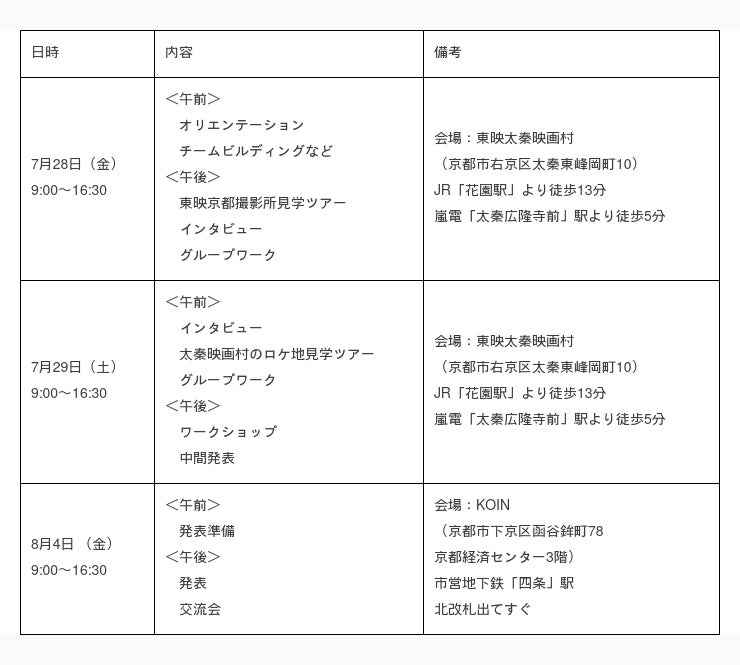 京都スタートアップ・エコシステム推進協議会の構成員である、一般社団法人京都知恵産業創造の森(京都府京都市 理事長:塚本 能交)は、東映太秦映画村及び一般社団法人i.club(東京都渋谷区 代表理事:小川 悠)と連携し、2023年7月28日、7月29日、8月4日の3日間、京阪神地域に在住の高校生や高専生を対象にアントレプレナーシップの醸成を目的とした教育プログラム「京都イノベーション・サマープログラム 2023」を、下記のとおり実施いたします。