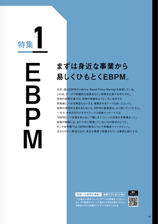 今号の特集1では、「[EBPM]まずは身近な事業から、易しくひもとくEBPM。」をテーマに、北海道芽室町、神奈川県葉山町、岡山県などの事例をご紹介しております。特集2では、「[財源確保]行政も稼ぐ時代、先をゆく自治体の手法と工夫とは。」をテーマに、山形県西川町、福岡県北九州市、茨城県つくば市などの取り組みをご紹介しております。