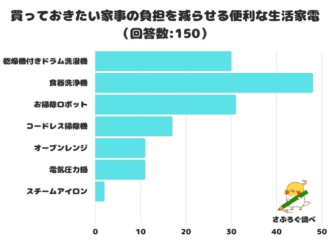 買っておきたい家事の負担を減らせる便利な生活家電をアンケートにて調査したところ、1位は「食器洗浄機」でした。