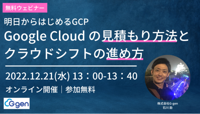 株式会社G-gen(本社:東京都新宿区、代表取締役:羽柴孝)は、無料ウェビナー「明日からはじめるGCP Google Cloud の見積もり方法とクラウドシフトの進め方」を12月21日 (水) 13時より実施いたします。