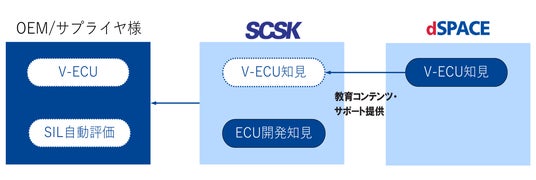 dSPACE Japanは、SCSKに教育コンテンツ・サポートを提供します。これを受け、SCSKはV-ECUの知見を補完し、ECU上のソフトウェア開発の知見を組み合わせて、完成車メーカーおよび部品メーカーの自動車開発の加速に向けた、V-ECUの環境構築とSIL(Software-in-the-Loop)シミュレーションの自動評価を支援します。また、dSPACE JapanとSCSK共同でV-ECU環境構築の専門エンジニアを育成し、VEOSでの走行実データの再現ならびにクラウド上の検証環境であるdSPACEのSIMPHERAへの移行についても推進していきます。SIMPHERAとVEOSの組み合わせによって、完成車メーカーと部品メーカーとの仕様すり合わせがロケーションフリーで実施可能となり、サプライチェーンの選択肢を拡げることが期待されます。