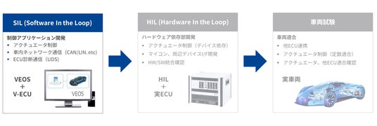 V-ECU環境でソフトウェアを開発することにより、ハードウェア依存部開発や車種適合開発の前工程である制御アプリケーション開発において、車内ネットワーク機能を介して複数のV-ECUとアクチュエータ制御を繋げた協調動作確認が可能になります。