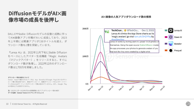 DALL-EやStable DiffusionといったDiffusionモデルの成熟に伴ってAI×画像市場が大いに成長しており、2023年上半期には関連アプリのダウンロード数が1億を突破しました。中でも『Lensa AI』はアバター生成機能のリリースを受けて人気が高まり、ダウンロード数が急増しています。