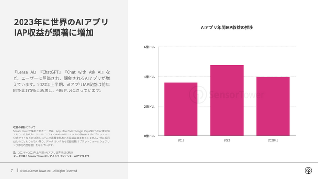 『Lensa AI』『ChatGPT』『Chat with Ask AI』など、ユーザーに評価され、課金されるAIアプリも増えています。2023年上半期、AIアプリのIAP収益は、前年同期比175%と急増し、4億ドルに迫っています。