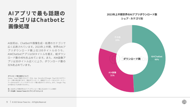 新しいAI技術は、Chatbotや画像生成・処理のカテゴリで広く応用されています。2023年上半期、世界のAIアプリダウンロード数上位100タイトルのうち、総ダウンロード数の49%はAI×Chatbotアプリ、31%がAI×画像アプリとなっています。