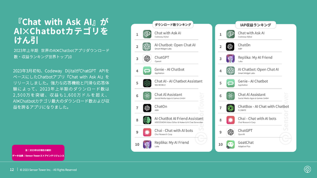 ChatGPT APIをベースにしたChatbotアプリ『Chat with Ask AI』は、強力な応答機能と円滑な応答体験によって、2023年上半期のダウンロード数が2,500万を突破し、収益も1,600万ドルを超え、AI×Chatbotカテゴリをけん引しています。