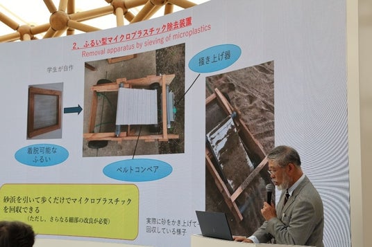 砂浜に混ざったマイクロプラスチックを効率的に回収するため、砂と塩分を分離する「浮遊型除去装置」や、砂浜を歩くだけで回収できる「ふるい型除去装置」といった独自の装置を開発しました。
