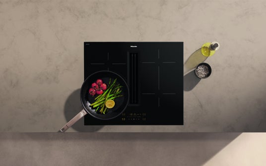 photo 5: 一体型換気システムを備えた60cm幅のKMDA 5649クッキングヒーターは、調理中に発生する蒸気を調理面から直接吸引することで、別途レンジフードを設置する必要がありません。これにより、視界を遮る要素のない、落ち着きと開放感のあるキッチンデザインを実現します。(photo:Miele)