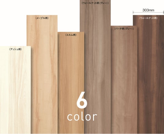カラーバリエーションは、ワイドな大面積に映えるよう、はっきりとしたコントラストの木目柄が特長の全6色。このうち、〈エルム柄〉と〈ウォールナット柄(グレー)〉はグランデのみの新色となります。