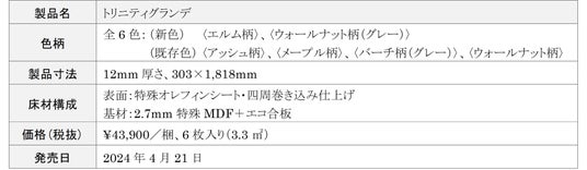 また、天然木では303mmものワイド幅を安定して調達しにくいため、無垢材で幅広デザインを量産することは難しいとされています。そのような中、無垢材のような幅広デザインをシートで表現した本製品は、当社独自の生産技術によって実現した、これまでにない床材となります。さらに、幅広タイプならではの溝の少なさによる清掃性アップに加え、『トリニティ』と比べて施工枚数が削減できるため、省施工にも貢献します。