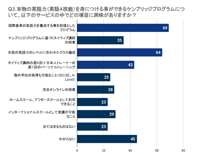 Q3で「本物の英語力(英語4技能)を身につける事ができるケンブリッジプログラムについて、以下のサービスの中でどの項目に興味がありますか?(複数回答可)」と質問したところ、宮城県で最も多かったのは「国際基準の英語力を養成する事を前提としたプログラム」で69名でした。次いで、「生徒の英語力のレベルに合わせたクラス編成」には64名、「ネイティブ講師の週4回+日本人トレーナーの週1回のパーソナルトレーニング」には43名が興味を持っています。一方で、「海外学位の取得も可能なこと(IGCSE、A-Level)」や「ホームスクール、アフタースクールとして利用できること」に関心を持つ人はやや少なめで、それぞれ25名、23名の回答でした。これらの結果から、多くの人は実用的な英語力の養成や個別のニーズに応じた指導に重きを置いていることが伺えます。