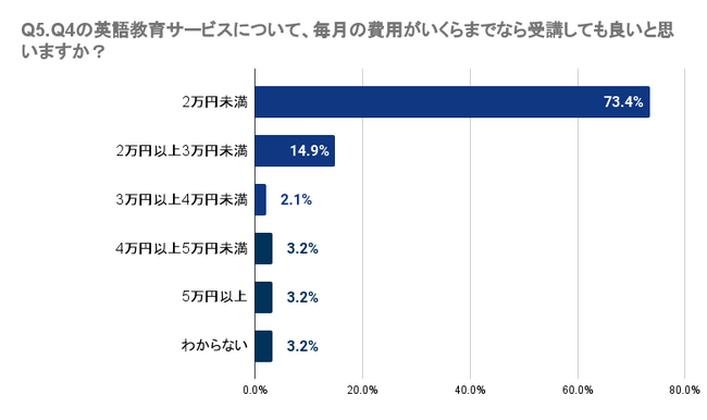 Q4で「受講したい」「料金が安ければ受講したい」「興味がある」と回答した人に、Q5で、「Q4の英語教育サービスについて、毎月の費用がいくらまでなら受講しても良いと思いますか?」と質問したところ、最も多い73.4%の回答者は2万円未満が適切と感じています。14.9%は2万円以上3万円未満、2.1%は3万円以上4万円未満と答えました。対照的に、4万円以上の費用を考える回答者は極少数で、4万円以上5万円未満が3.2%、5万円以上が3.2%でした。これにより、宮城県では多くの人が3万円未満の価格帯を望んでいることが明らかとなりました。
